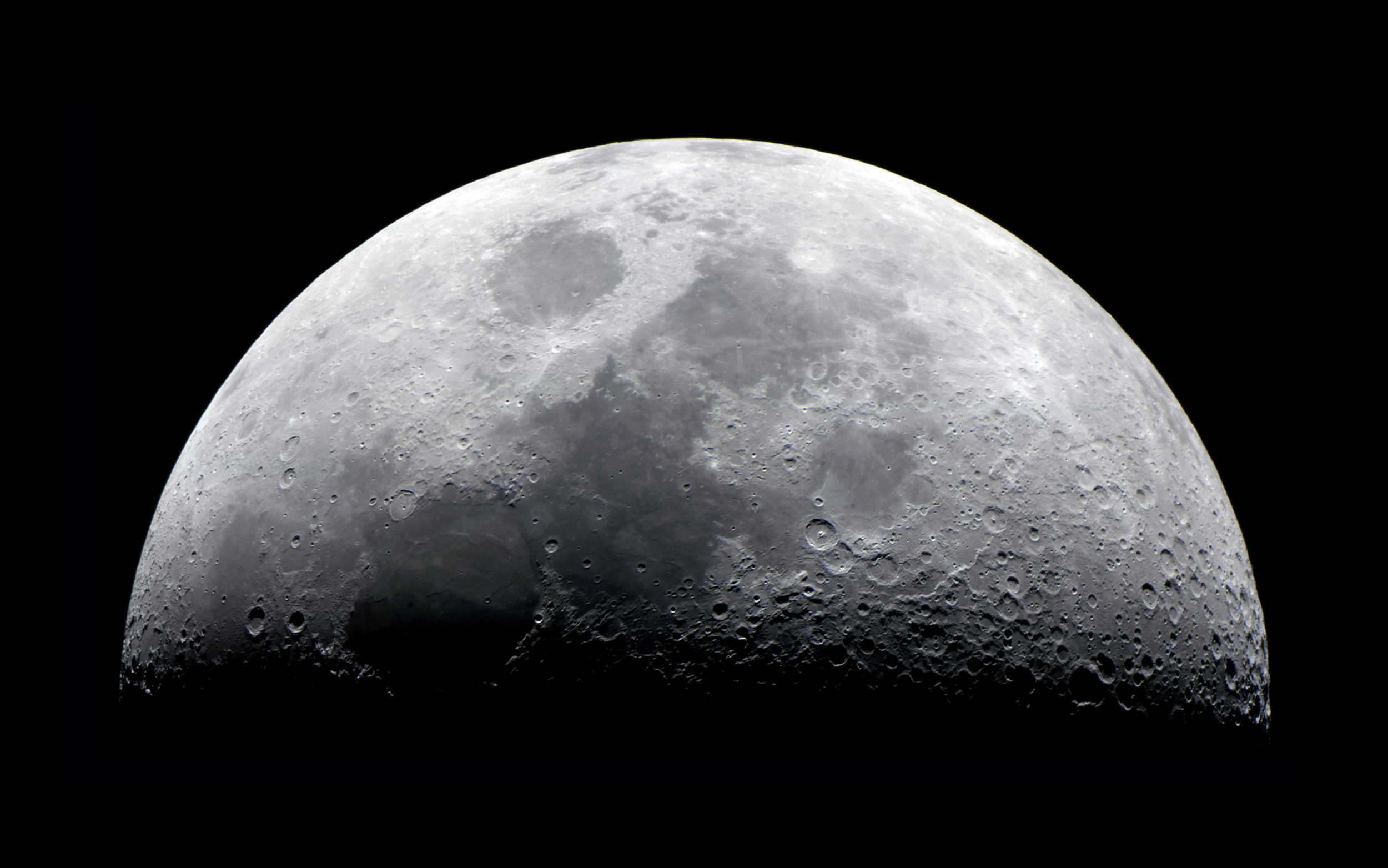 Here is that first quarter moon picture available shot through the 8 inch at high resolution taken at f16 using a Canon 350 DSLR. The image is a six frame mosaic made of 60 sub-frames. |