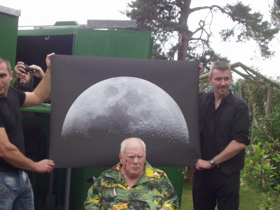 Sir Patrick Moore seated, with a high resolution image of the Moon taken by Bruce (right). |
