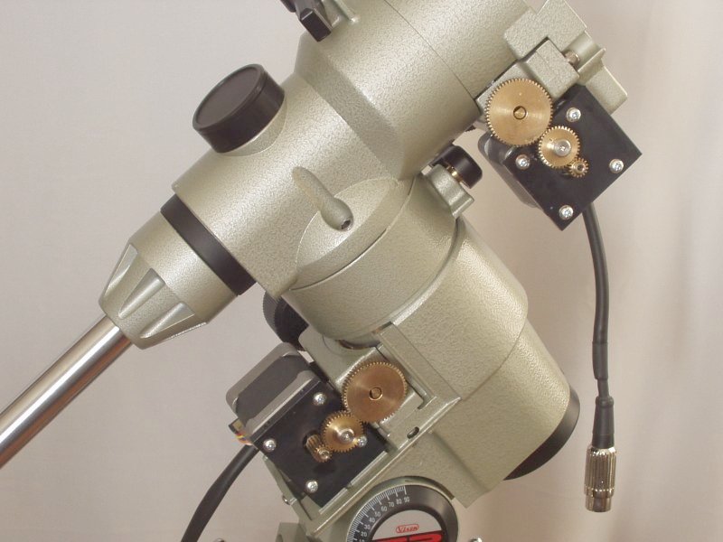 This kit allows operation of the Super Polaris / Great Polaris type mount up to 3 deg/sec for fast slewing. It is most impressive in operation. The motor brackets fit where the original motors fit and substantial gears transfer the motion to the slow motion axes. By microstepping the motor assemblies (64 per step) there is almost freedom from vibration with the very small steps and a huge dynamic speed range and hence considerably improved torque and smoothness in operation. GOTO features on the handset include telescope co-ordinate readout (RA and DEC), entry of new co-ordinates, backlash correction, Periodic Error Calibration etc. The kit is supplied with an on-board database so computer connection is optional but connects with standard planetarium programmes. Motors, brackets, gears etc have been designed and selected by ourselves to get a quality system that will last. It is substantial enough to withstand (mis)use and the major components can be transferred to your next mount.