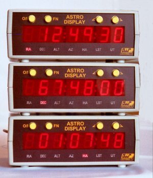 ASTRO DISPLAY UNITS FOR THE OBSERVATORY (NEW for 2004) £160.00 EACH Provides observatory style large illuminated readouts from AWR, MEADE and VIXEN drive systems fitted with a computer port. Display one of seven parameters from RA, DEC, ALT, AZ, HA, LST, UT. It is transparent to serial data flow if a computer is connected so the telescope can still be controlled from Planetarium programmes. This product can also run from Heidenhain encoders. Supplied with one serial lead of your choice and 12V power supply. Size 190 x 70 x 140mm with 20mm high digits. Put 5 in a stack - awesome! THREE SHOWN HERE |