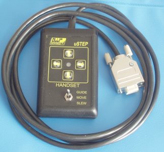INTELLIGENT HANDSET with GOTO and computer connection. This provides coordinate calibration, programmable drive rates, position readout, GOTO facility, tube reversal procedure etc. Design aim of 20 arc seconds accuracy depending on telescope configuration. SIMPLE HANDSET has GUIDE, 2x and SLEW adjust rates in all directions. The Intelligent Handset is normally powered through Drive Box.