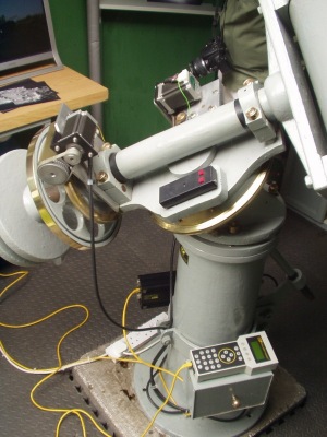Here is the ASTROFOX 36 inch telescope being installed in its dome for the Amateur Astronomers of Finland - URSA. AWR provided the motors, Heidenhain encoders, Microstepping drivebox and Intelligent Handset (all operating at 24 volts) to get the ultimate in performance from the mechanics. Designed encoder resolution is below 10 arcseconds, yet slew speeds up to 0.8 degrees per second. The external encoders go through our Quadrature Decoder Box and then into the Intelligent Handset instead of the normal virtual encoders. This means that the pointing accuracy and GOTO performance is as good as the external encoders and allows for some mechanical inconsistencies in the drive train. For further information contact AWR or ASTROFOX | ![]() |